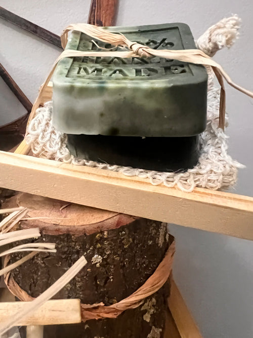 Bar soap with Sisal soap saver bag and wooden soap holder
